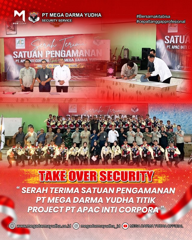 Pada hari Senin, 22 September 2026, telah dilaksanakan Apel Serah Terima Pekerjaan Security di lingkungan PT Apac Inti Corpora. Acara ini merupakan bagian dari proses resmi pergantian pengelolaan jasa pengamanan dari PT Apac Inti Corpora selaku penyedia sebelumnya kepada PT Mega Darma Yudha sebagai penyedia jasa keamanan yang baru.
